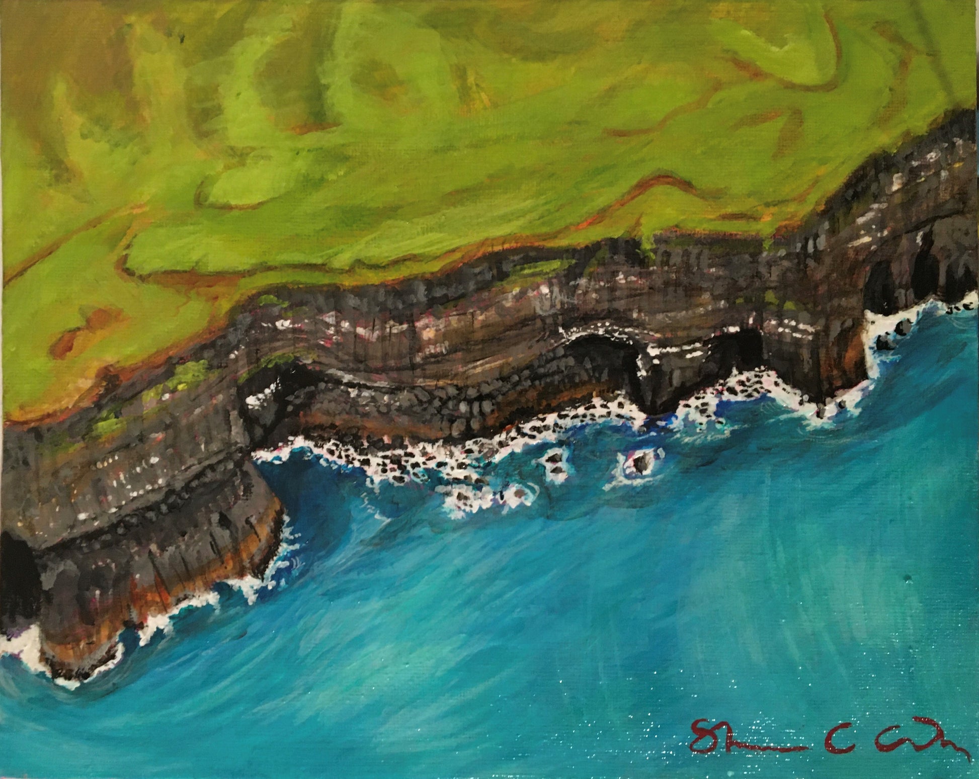 Inspiration is the unique bird's-eye view of Iceland from a helicopter make this painting almost an abstract with the complementary green and aquamarine, divided only by a ledge of stone and border of bubbles.
